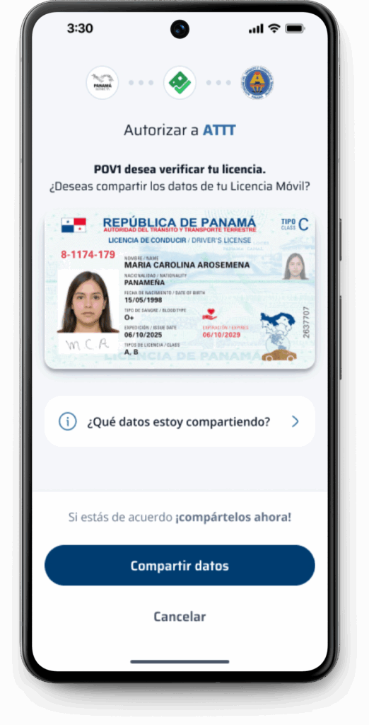 Al escanear el QR, la app del verificador enviará automáticamente una solicitud al usuario. Esta solicitud define qué datos se desean validar de la licencia móvil del usuario y este último podrá ver que datos está compartiendo.